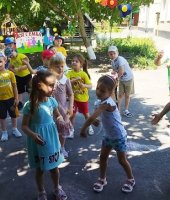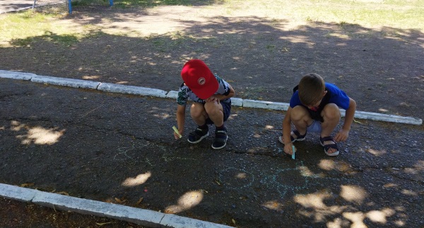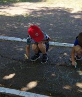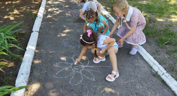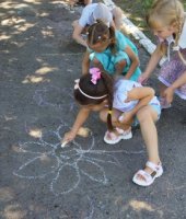Выполняя задания, ребята играли, пели, танцевали. Прозвучало много стихов, пословиц о семье, дружбе, верности. Рисовали на асфальте мелками ромашку.