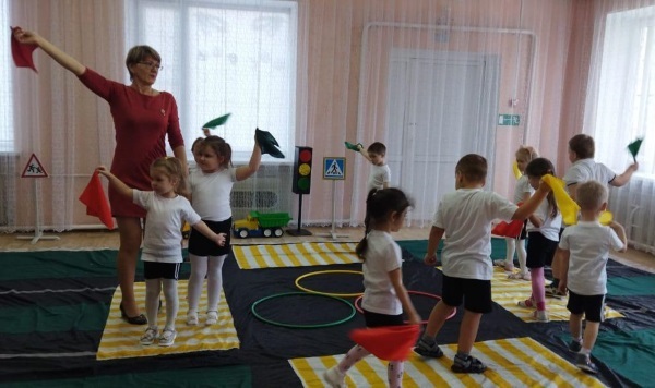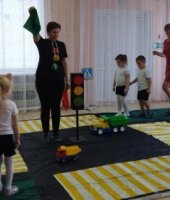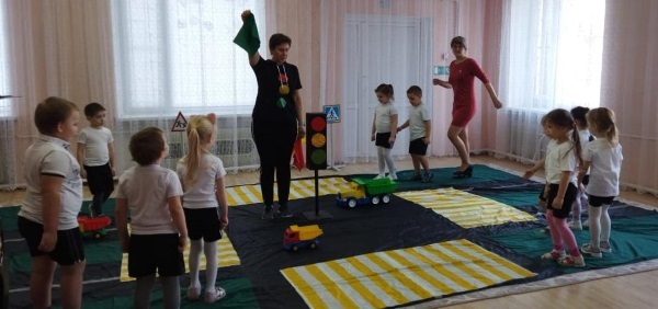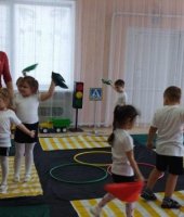 Ребята услышали историю спора цветов светофора «Какой цвет самый главный?», отправились в гости к Светофору (в роли инструктор по ФК Улевская Н.Г.). С увлечением разгадали хитрые загадки о транспорте, правильно расставили цвета на светофоре. Светофорчик предложил поиграть в игру «Разрешается – запрещается», в которой дети показали свои знания о правилах поведения в общественном транспорте. Поучаствовали в эстафетах «Стой-иди», «Надземный – подземный переход», «Разложи по цвету светофора платочки», «Передай жезл другу».