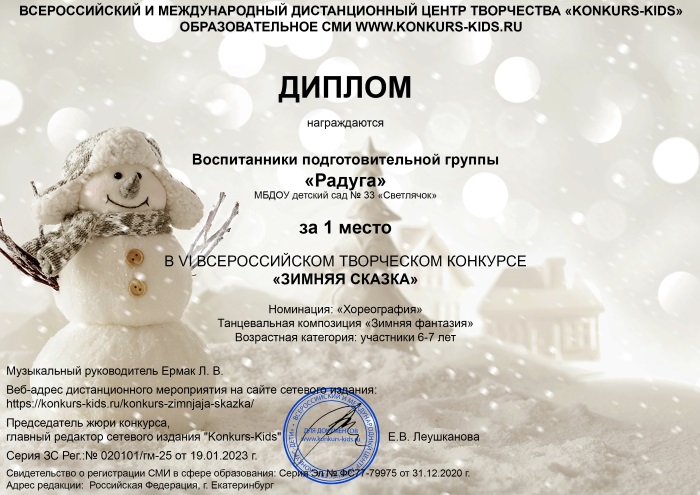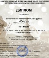 Видео танцевальной композиции отправила на всероссийский конкурс «Зимняя сказка». Танцевальная композиция в исполнении наших воспитанников получила призовое место - диплом 1 место.
