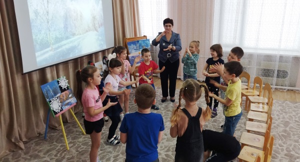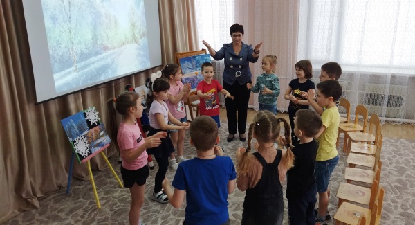 В начале занятия я пригласила ребят в музыкальный зал. Познакомила с целью их посещения «Музыкального салона», предложила внимательно посмотреть и прослушать видеоролик П.И. Чайковского «Зима» из цикла «Времена года» «У камелька».