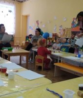 В начале собрания я познакомила родителей с видами нетрадиционных техник рисования. Затем малыши вместе с родителями отправились на мастер класс в страну «Рисовандию» на автобусе. В этой стране взрослые и дети отгадывали загадали о рыбке, снеговике, машине, а ответы на загадки рисовали используя различные приёмы: пальчиками, ватными палочками, мятой бумагой, пробками, ладошками.