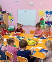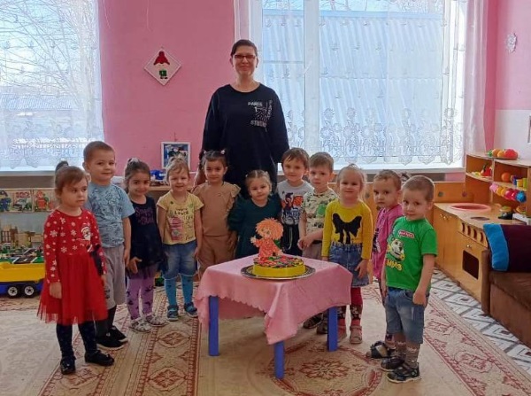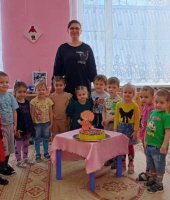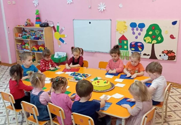 Также приготовили угощение – торт слепив из пластилина жгутики, свернув их получили, цветы ими мы украсили торт, который вручили имениннику.