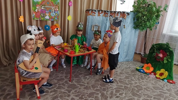 В рамках этого дня мы с воспитателем старшей группы «Звездочка» Мамай Н.М. пригласили воспитанников на театральное представление музыкальных сказок. На «сцене» музыкального зала мальчишки и девчонки старшей группы превратились в настоящих артистов перевоплотились в героев сказки «Теремок на новый лад. За свое выступление юные артисты были награждены дружными аплодисментами.