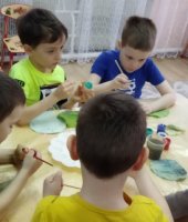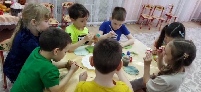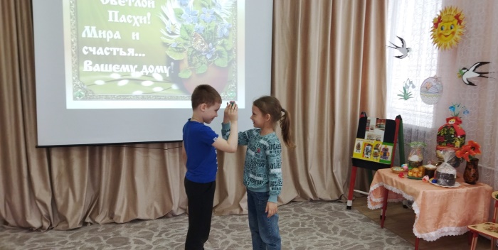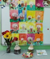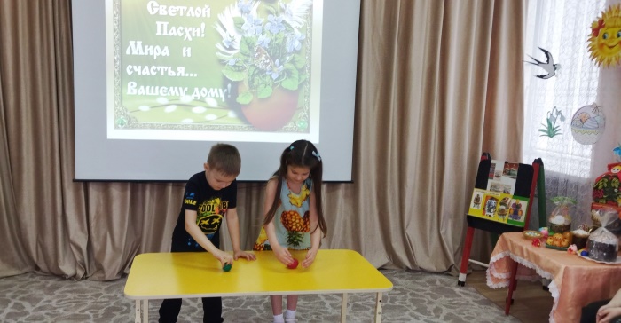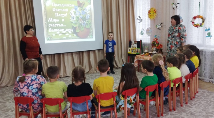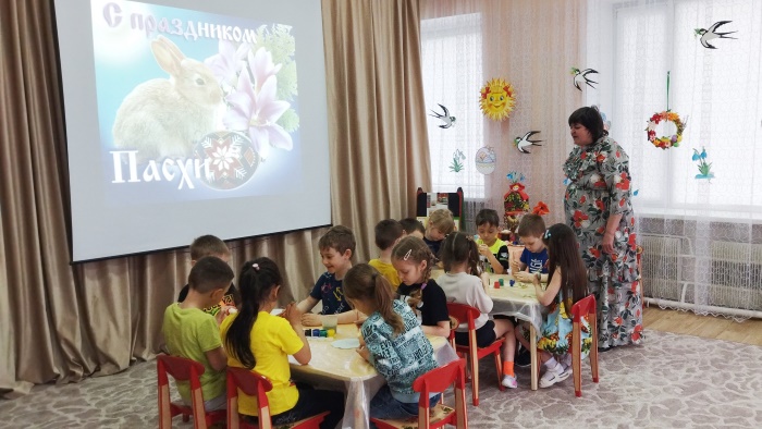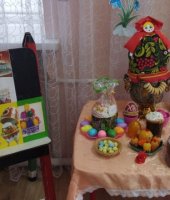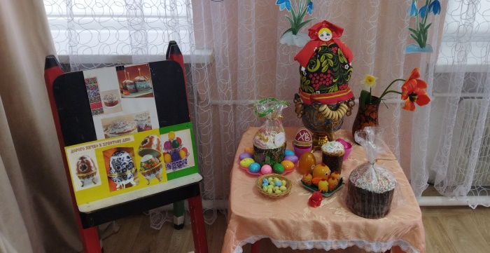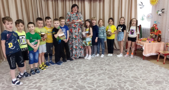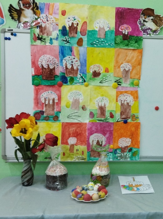 В преддвериях этого праздника воспитателем были подготовлены интересные, познавательные материалы на темы: «Народные традиции русской пасхальной недели», «Великие христианские праздники», были проведены беседы: «Пасха», «Как в старину люди готовились к Пасхе». Были разучены народные игры, связанные с пасхальными традициями. Читали пасхальные стихи А. Блок «Вербочки», А. Майков «Христос - Воскрес!». Музыкальным руководителем Ермак Л.В. была организованна музыкальная гостиная, где ребята слушали музыкальные произведения, перезвоны, разучивали песни, заклички и потешки о весне. Также дети рисовали акварелью куличи, раскрашивали корзины с Пасхальными угощениями. Организовали выставку рисунков и куличей с расписными яйцами. Родительница - Лбова Полина вместе с сыном Артемом испекли ароматные куличи, для пасхальных посиделок.