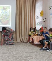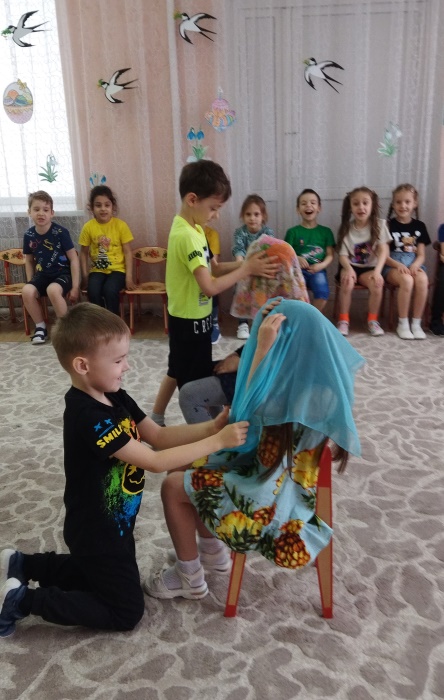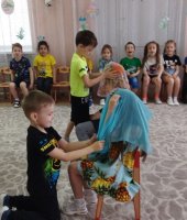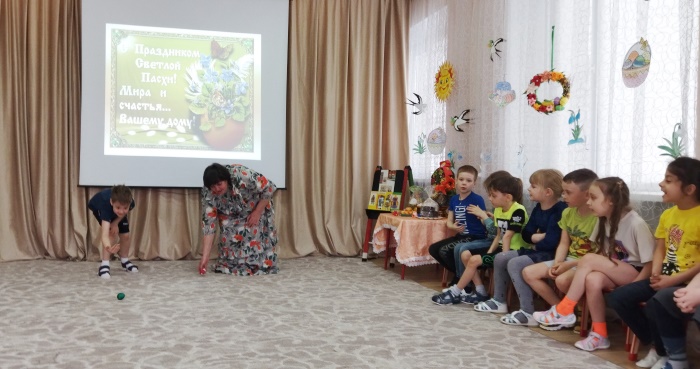Дети ведущей Ермак Л.В. пришли в гости в терем к Хозяюшке (эту роль я взяла на себя). Ермак Л.В. рассказала детям о приближающемся празднике «Пасха» и предложила посмотреть презентацию «Великая Пасха» и вспомнить историю праздника, а Хозяюшка рассказала о традициях и приметах Великой Пасхи и организовала народные игры: «Раскрути яйцо», Пасхальный разгуляй», «Перекати яйцо», «Собери сестричку в Храм». Дети с большим интересом поиграли в народные игры.