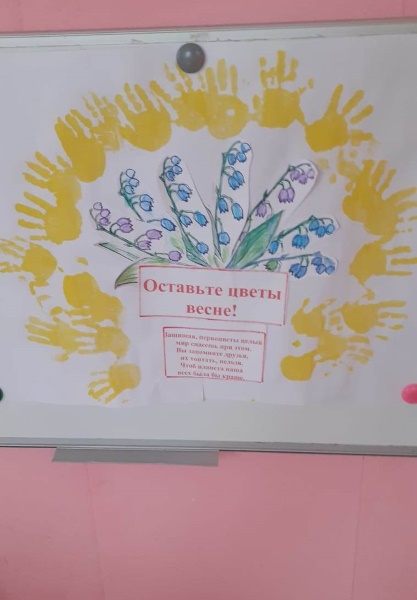 Для родителей малышей были подготовлены красочные тематические листовки. Дошколята изготовили плакат «Оставьте первоцветы весне» и подарили его ребятам младшей группы.