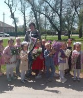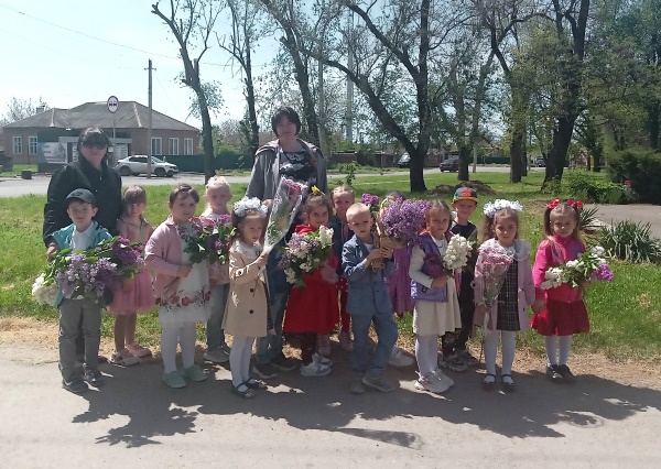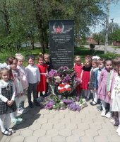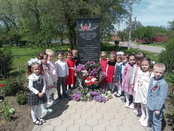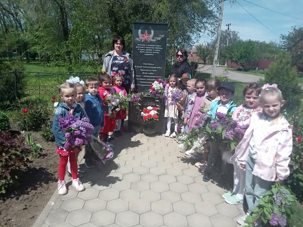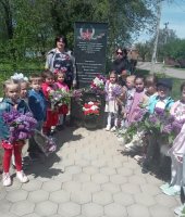 По традиции воспитанники старшей группы вместе с воспитателями Мамай Н.М и Левиной Е.И. возложили цветы к памятнику погибшим воинам, который находится по пер. Первомайский.