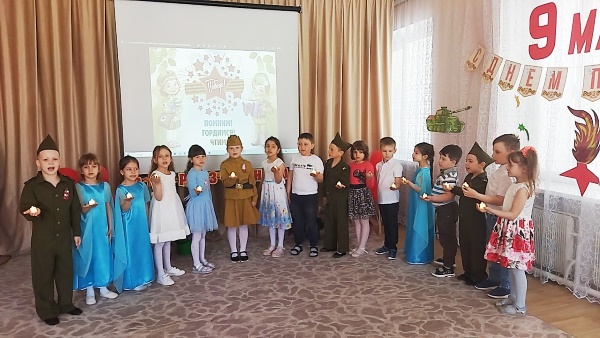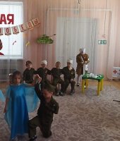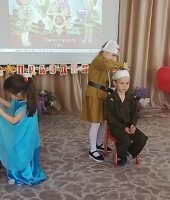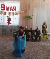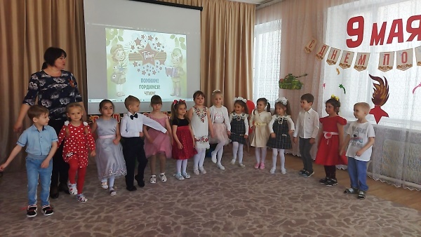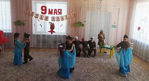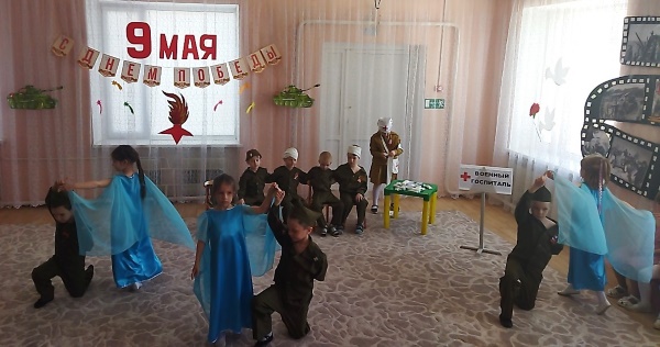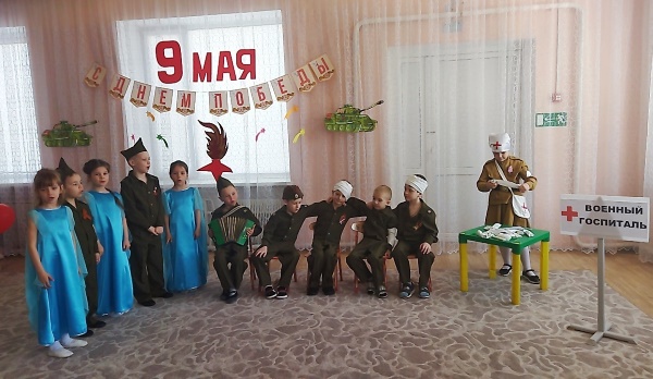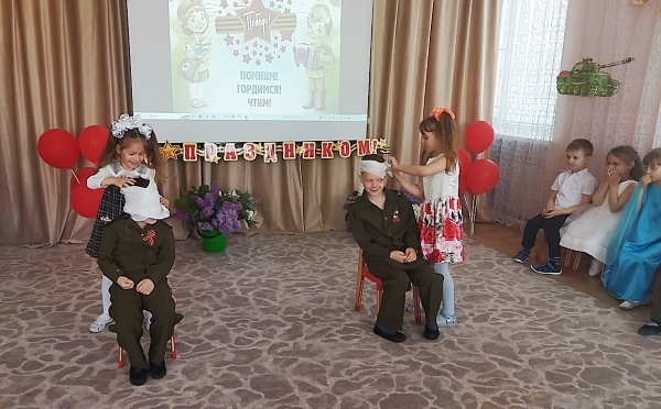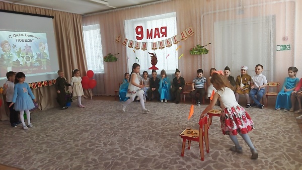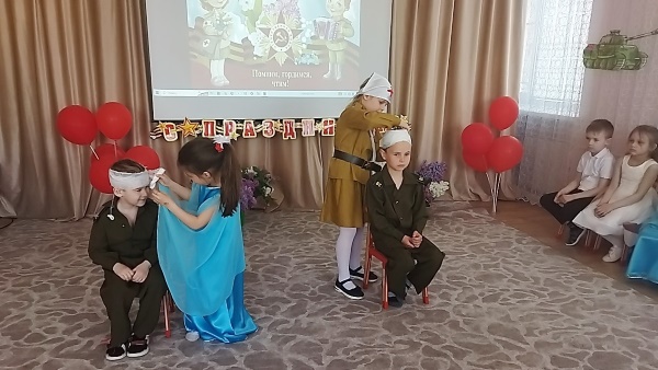 Ведущая праздника воспитатель Мамай Н. М. рассказала о подвигах советских солдат и о тех кто работал в тылу в годы Великой Отечественной войны. На празднике дети, с чувством особой благодарности читали стихи, исполняли песни, танцевали вальс. Инсценировали сценку «Военный госпиталь», играли в игры: «Вперёд к флажку», в которой проявила ловкость и смекалку, в игре «Перебинтуй раненого» дети проявили сочувствие, сноровку, ловкость.