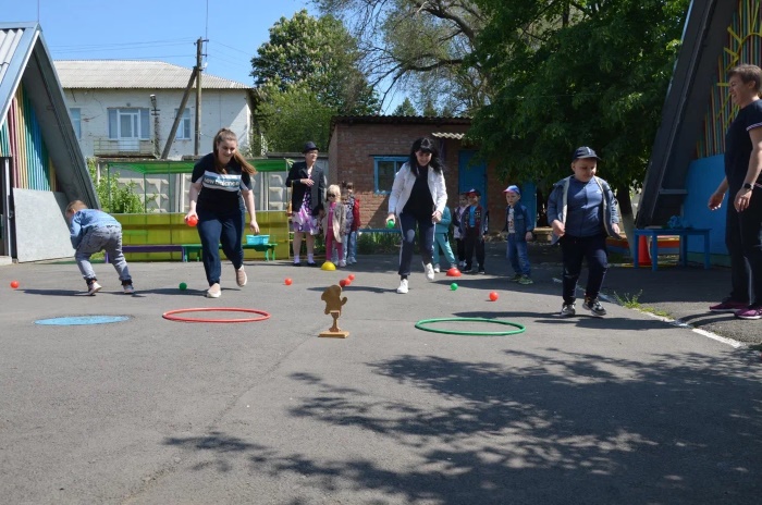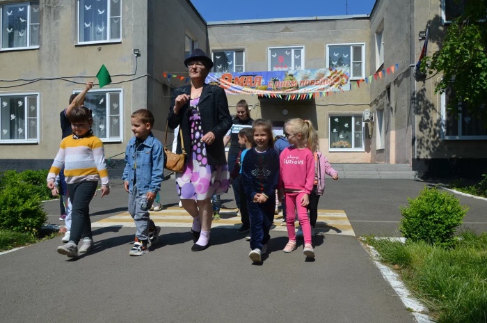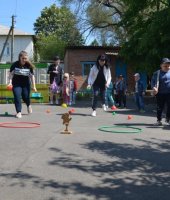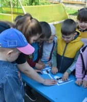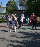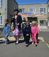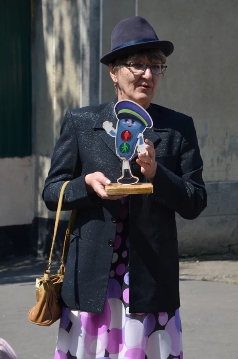 Физкультурный досуг проходил на свежем воздухе. К ребятам пришла в гости Шапокляк (роль я взяла на себя). Она помогла ребятам освежить в памяти, как правильно переходить улицу по правилам дорожного движения и где можно играть. Шапокляк предложила сложить пазлы дорожных знаков и назвать их значение. Были проведены игры-эстафеты «Разложи по цвету мячи в обручи», «Красный, желтый, зеленый». Затем родители в роли водителей перевозили детей в заданный пункт.