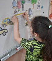 По возвращению с экскурсии мы оформили фотоколлаж «Правила дорожного движения». Для создания фотоколлажа ребята разукрашивали изображения дорожных знаков, машин, деревья, детей, затем вырезали их и приклеили на ватман. Дошколята с большим удовольствием и интересом выполняли задания, воплощая увиденную проезжую часть, пешеходный переход, движение транспорта. Они были в восторге от совместной работы и результата.
