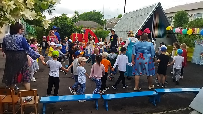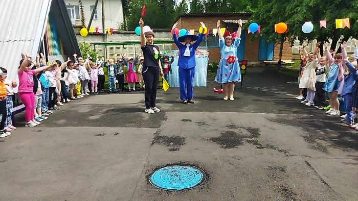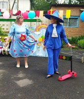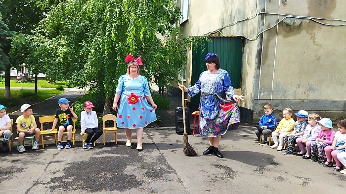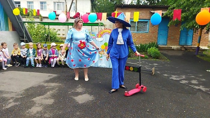 Все вместе позвали Лето, а появилась бабуля Яга (в роли воспитатель Мамай Н. М.), переодетое в лето и сообщила детям, что украла Лето, но обещает вернуть если ребята поиграют и потанцуют с ней. Неожиданно на самокате, нарушая все правила дорожного движения, сбивая с ног все на своем пути, появляется Незнайка (в роли учитель -логопед Гончарова С.С.). Светофор (в роли инструктор по ФИЗО Улевская Н.Г.) напомнил детям и Незнайке, что очень важно соблюдать и не нарушать ПДД. Дошколятам удалось развеселить бабушку Ягу и она вернула всем замечательное Лето (в роли воспитатель Агафонова Л.М.). Праздник завершился песней «Улыбка».