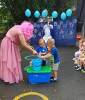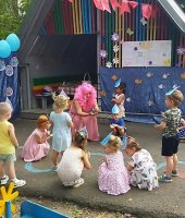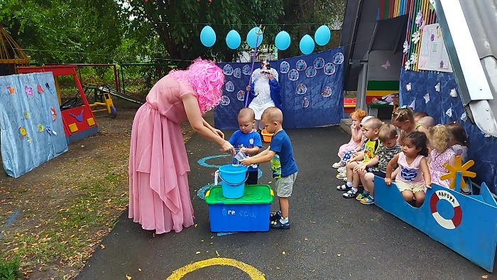 В заключении праздника были игры с мыльными пузырями и праздничная дискотека. Довольные, дети разошлись по группам, пить непростой сок, его Нептун «превратил» в морской.