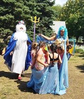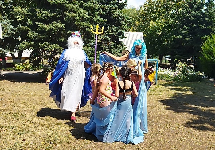 Дошкольники старших групп «Капельки», «Ромашка» и подготовительной группы «Звездочка» (каждая группа в отдельности) побывали в гостях у могучего властелина морей и океанов царя Нептуна (в роли воспитатель Мамай Н.М.) и его дочери Русалки (в роли учитель – логопед Гончарова С.).