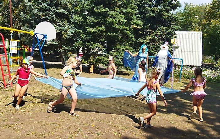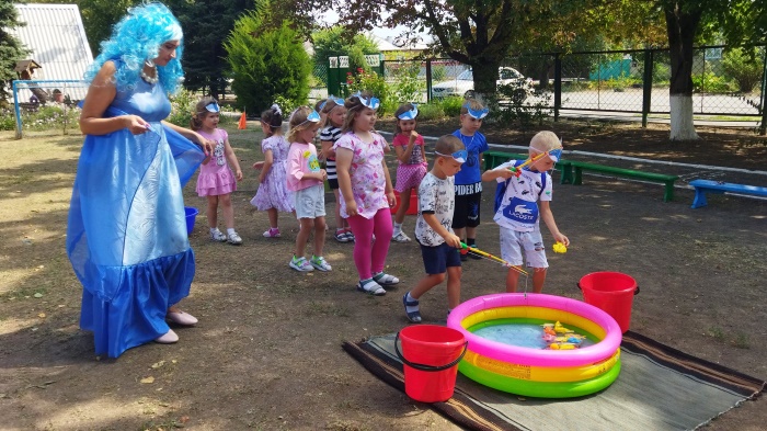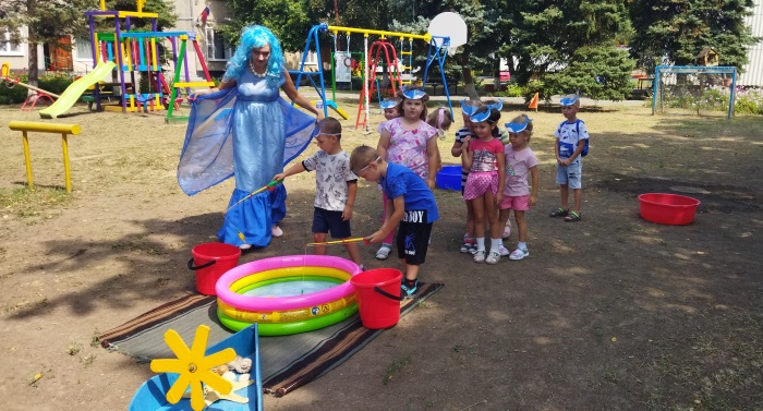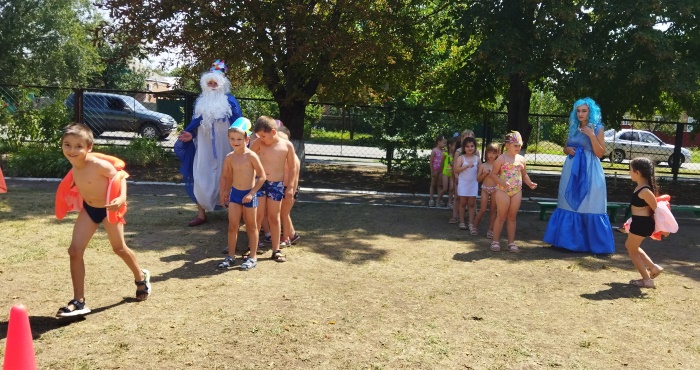 Дети были очень рады этой встрече. Дружно, весело играли в игры «Плавуны», «Морская фигура на месте замри», «Подумай и назови»; соревновались в веселых эстафетах: «Водоносы», «Поймай рыбку», «Собери жемчужинки на морском дне», пели морские песни, играли в игры. Девочки-русалки исполнили морской танец под песню «Русалочка».