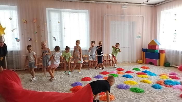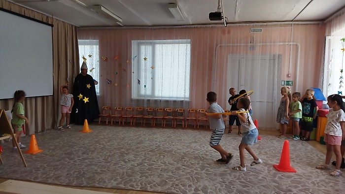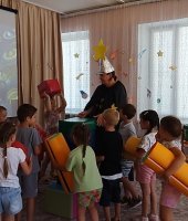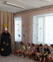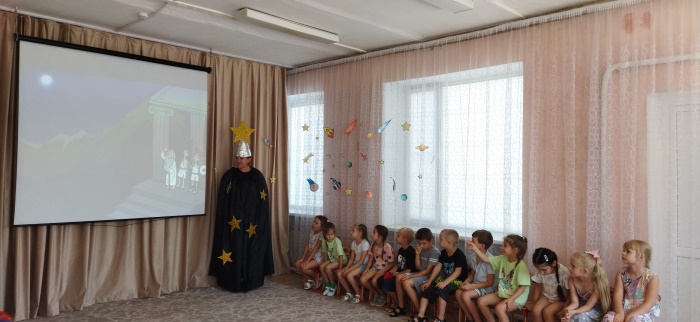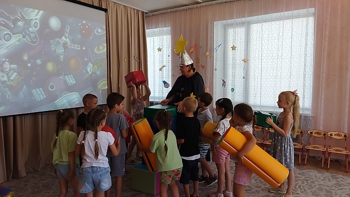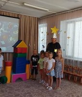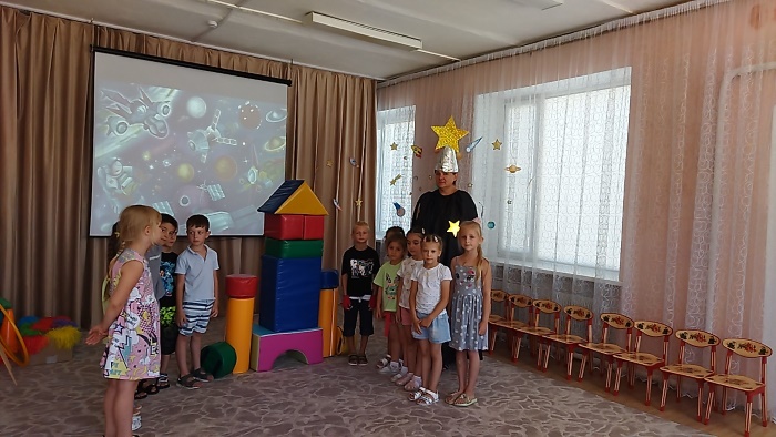 Итоговым мероприятием тематической недели стало развлечение «Космическое путешествие». В гости к ребятам пришел Звездочёт (роль взяла на себя) и предложил отправиться в путешествие по просторам вселенной.