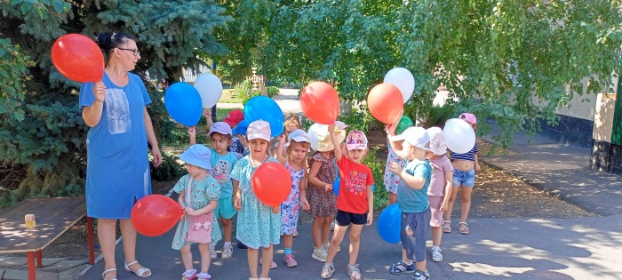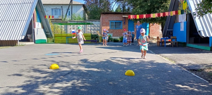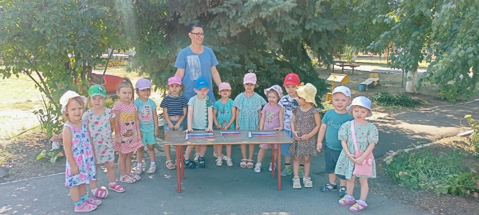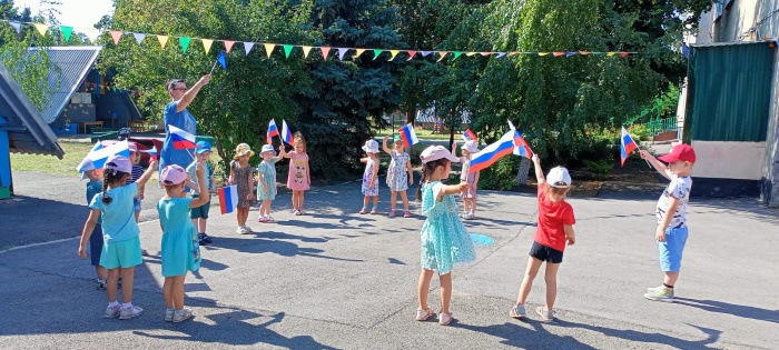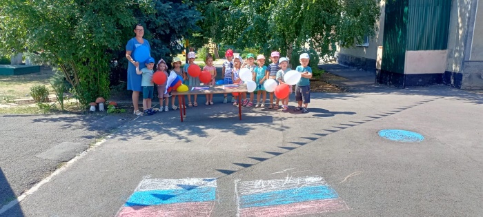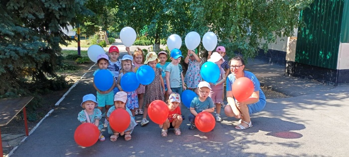 В средней группе «Непоседы» 22 августа в честь дня рождения государственного флага РФ прошло тематическое мероприятие «День государственного флага Российской Федерации». Ребята узнали об истории появления Российского флага и его значимости для нашего государства. В ходе продуктивной деятельности дети разукрашивали акварелью флаги, танцевали с флажками, поучаствовали в командных соревнованиях, собрали картинку флага из частей и на асфальте цветными мелками раскрашивали флаги. Из надувных шаров сделали флаг РФ.