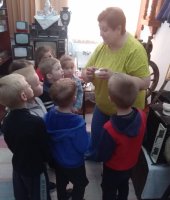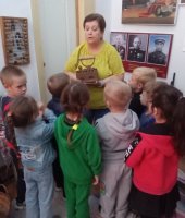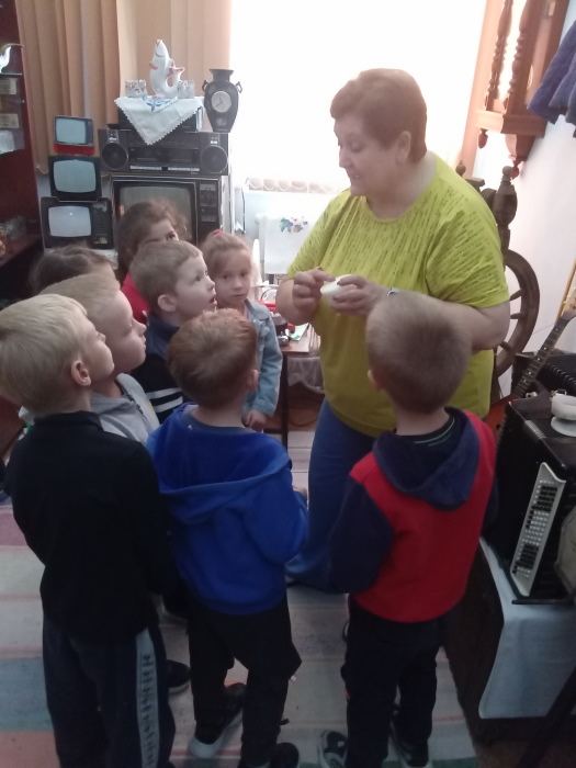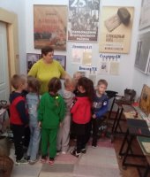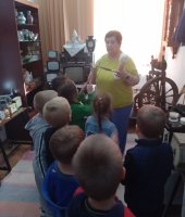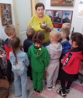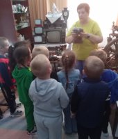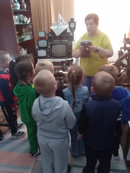 Юные воспитанники окунулись в историю и быт русской деревни, познакомились в домашней утварью того времени. Особый интерес у детей вызвал экспонат серп, прялка и зубной порошок. Ребята с удовольствием слушали и с любопытством рассматривали экспонаты, задавали вопросы. В завершении экскурсии Строкова Т.В. сфотографировала детей на старинный фотоаппарат и сделала видео на старинную камеру.