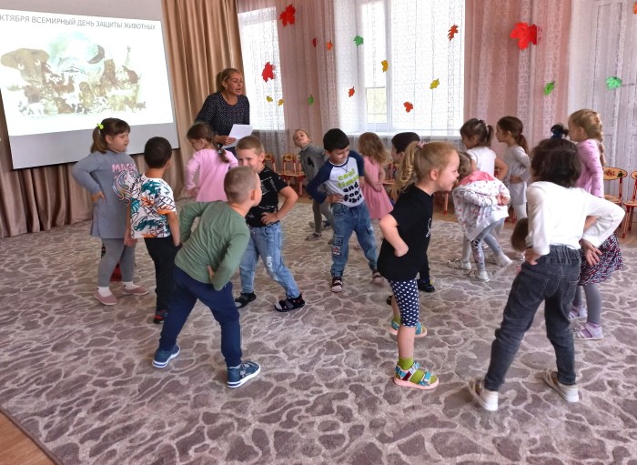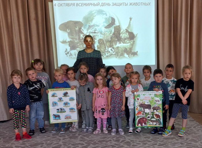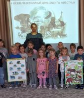 В старшей группе «Ромашка» состоялось тематическое мероприятие, посвященное Всемирному дню защиты животных. С воспитанниками была проведена беседа «Береги животных» с демонстрацией презентации «Животные Красной книги». В ходе мероприятия ребята отгадывали загадки, играли в игры «Подскажи словечко», «Найди дом животного». Детям очень понравились динамические паузы: «На водопой», «Домашние животные», в которых они имитировали движения разнообразных животных. Ребята поделились своим опытом общения с представителями животного мира: рассказывали о своих домашних питомцах и о походах в зоопарк, океанариум.