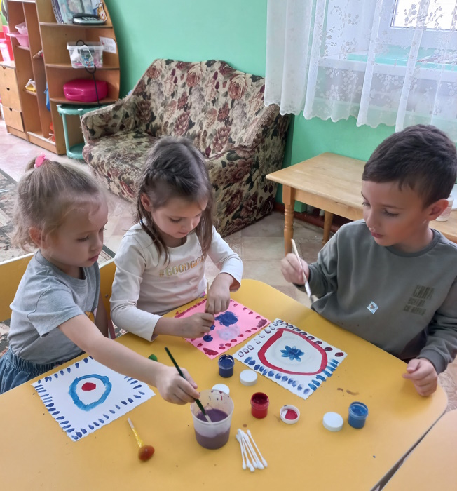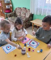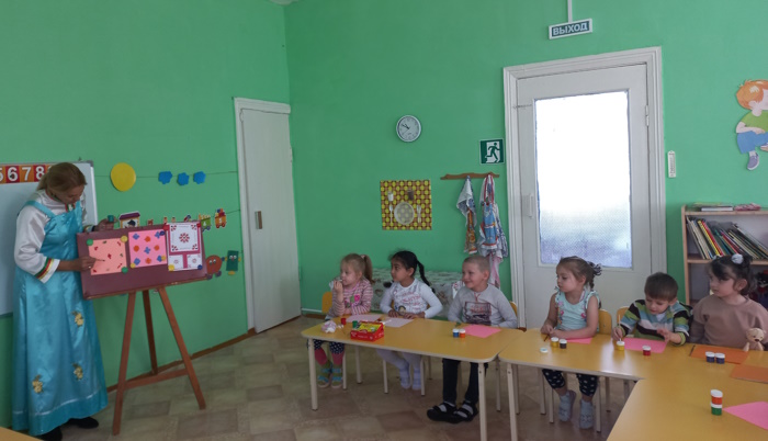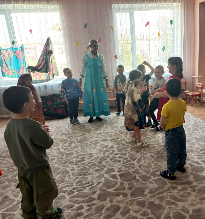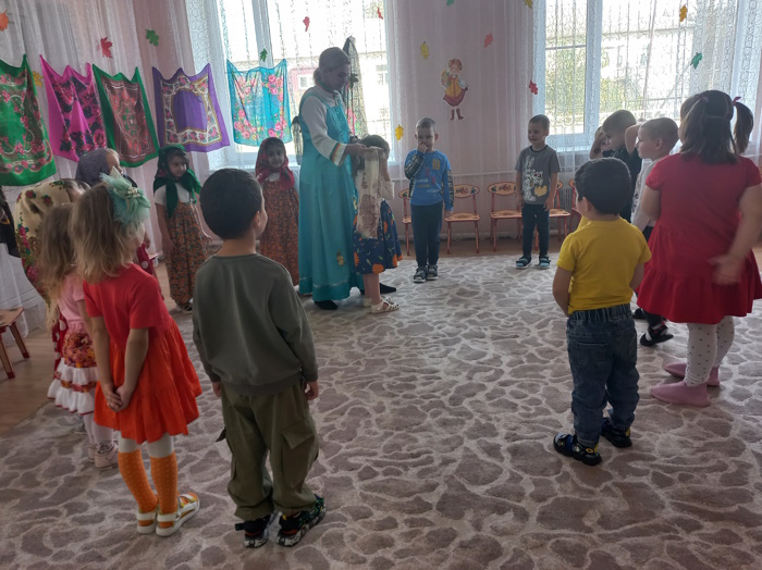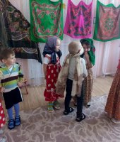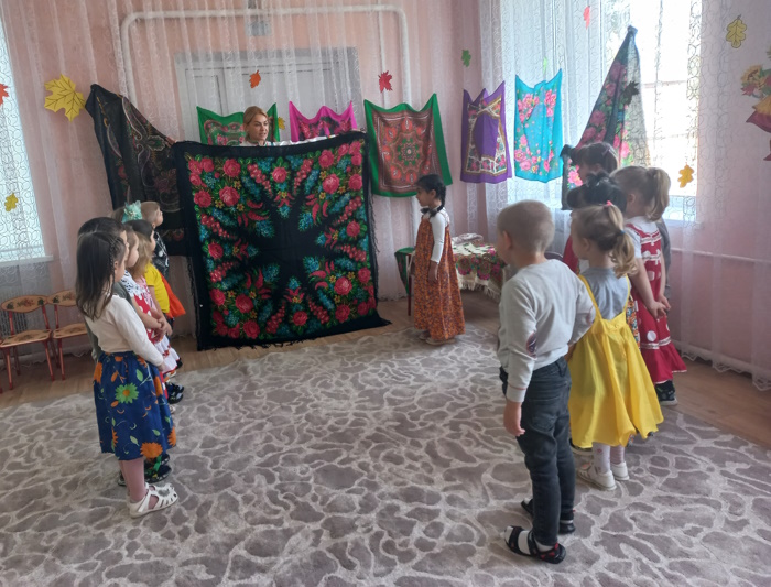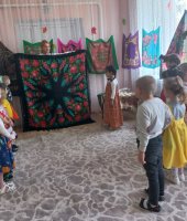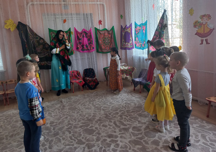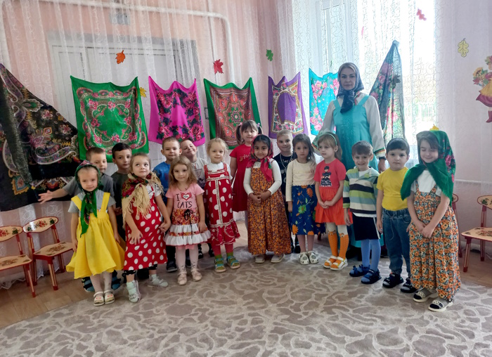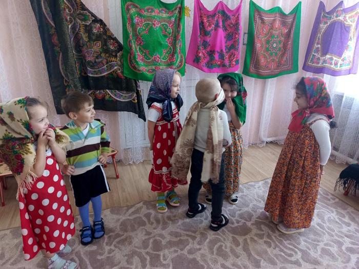 С целью развития духовно нравственного воспитания детей дошкольного возраста и приобщению к народным традициям в старшей группе «Ромашка» мною было подготовлено и проведено мероприятие «Празднования Покрова Дня». В ходе мероприятия дети познакомились с историей праздника, познакомились с народными традициями, обрядами, пословицами и поверьями на Покров. С детьми были проведены русские народные игры: «Удочка», «Арина», «Облупа». Для ребят была организованна небольшая выставка платков, с целью ознакомления с головными уборами женщин в старину. А в группе воспитанники украсили узорами свой платочек.