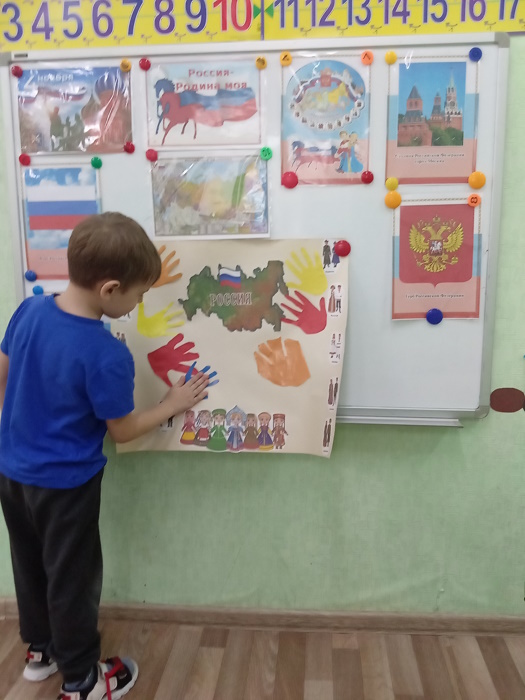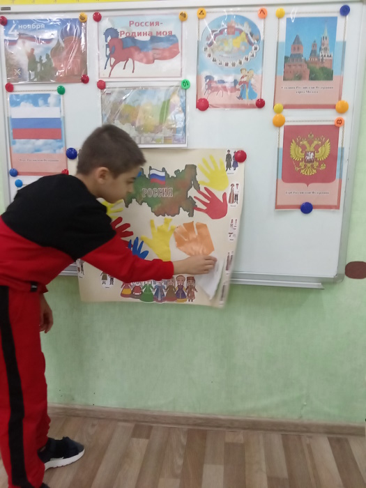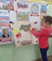 В завершении мероприятия вокруг карты нашей России выложили «Хоровод дружбы» из своих ладошек. Это означает, что мы вместе едины , а значит непобедимы. История учит нас: поодиночке, порознь не сделать того, что можно сделать вместе. Так и в жизни бывает. Один человек посадит дерево, а все вместе - сад. Дружба объединяет людей и народы. Страна сильна тогда, когда она едина. Поэтому есть у нас такой важный праздник - День народного единства!