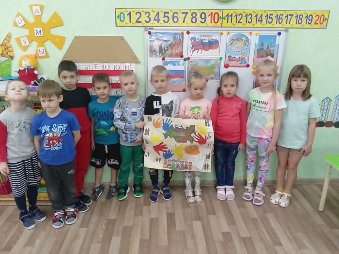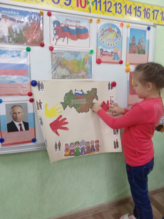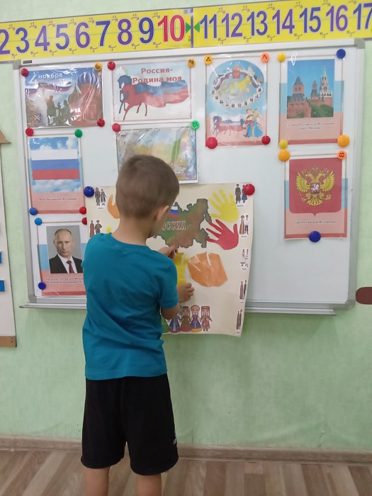 4 ноября вся страна празднует – день народного единства. Это праздник единства всех людей проживающих в нашей большой и многонациональной стране. Праздник является символом уважения и гордости за великое прошлое нашего государства. В подготовительной группе «Звёздочки» прошло тематическое мероприятие, посвящённое этому важному дню в истории нашей большой страны. Мы с ребятами говорили об историческом прошлом нашей страны, о великих людях, об их подвигах во имя независимости, узнали возникновении этого праздника 4 ноября. Дети играли в игру с мячом: «Какая наша Россия», где поймав мяч называли слова определения. Детям очень понравилась игра «Человек к человеку», которая учит быть дружными и сплочёнными.