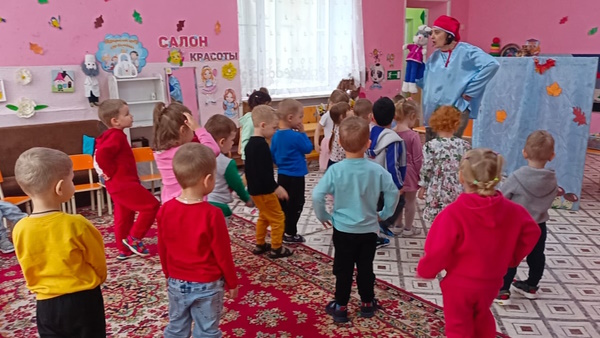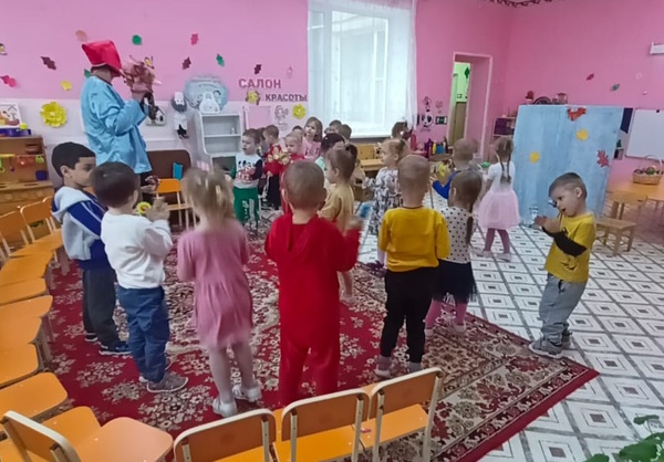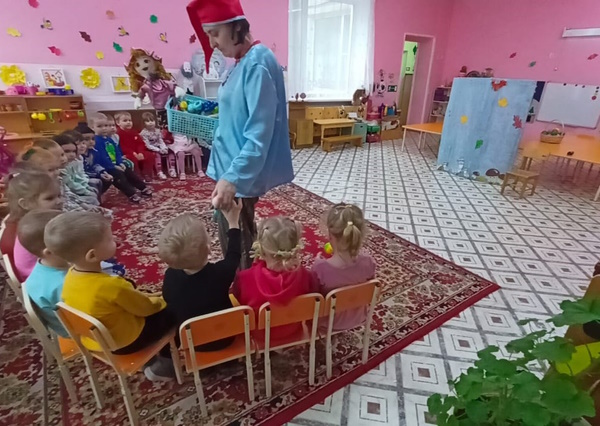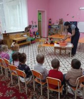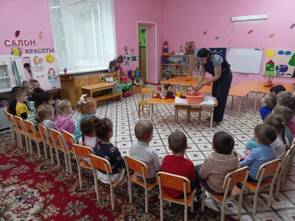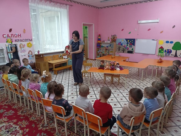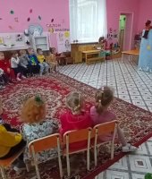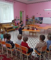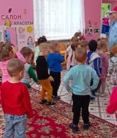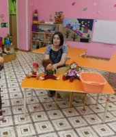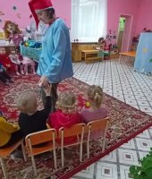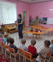 Итогом недели стало развлечение «В гости к игрушкам». Веселый Петрушка (роль взяла на себя) пригласил малышей к себе в гости. И ребята отправились на паровозике в страну игрушек. Там они встретили: зайку, медвежонка и куклу. С зайчонком ребята поиграли в игру «Возьми платочек» и «Заинька пойди в сад», медвежонку помогли собрать мячики. А кукле Кате сначала рассказали, как надо правильно обращаться с игрушками и станцевали веселый танец с погремушками. Попутешествовав весёлые, с хорошим настроением ребята вернулись в детский сад.