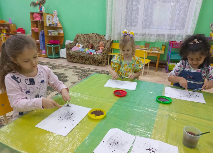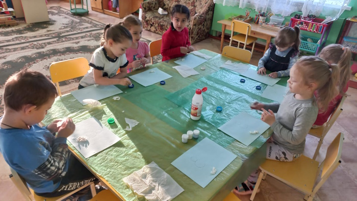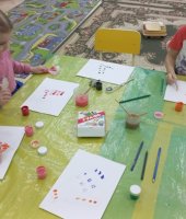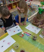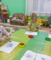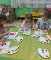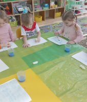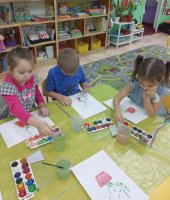 В начале учебного года мною был разработан проект по нетрадиционному рисованию «Цветные фантазии». Свою работу я начала с хорошо знакомых для детей техник: рисование пальчиками и ладошками. Затем постепенно вводила новые техники: рисование ватными палочками, тычок жесткой кистью, рисование губкой, рисование смятой бумагой, рисование восковыми мелками. Дети с интересом осваивали новые виды изобразительных техник, печатанье листьями, рисование по шаблону, способам изображения разных объектов приемом обрисовывания готовых шаблонов разных геометрических форм, в результате у детей развивается координация движений, мелкая моторика рук.