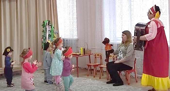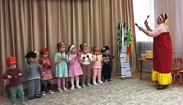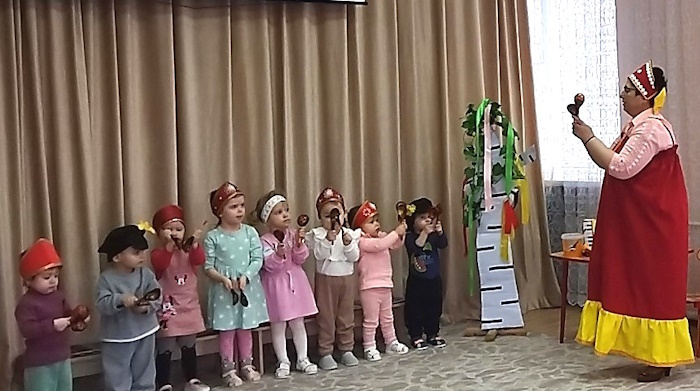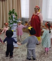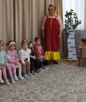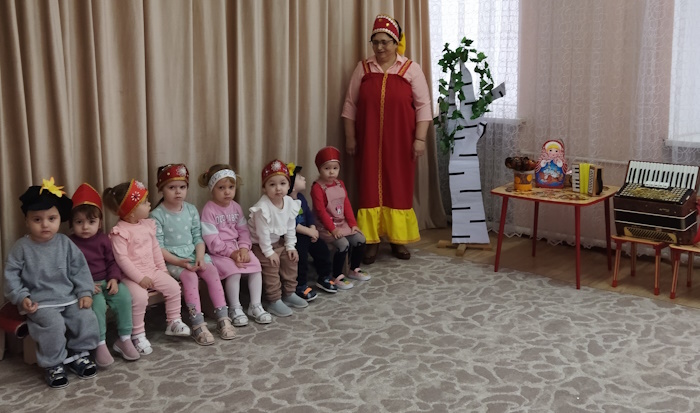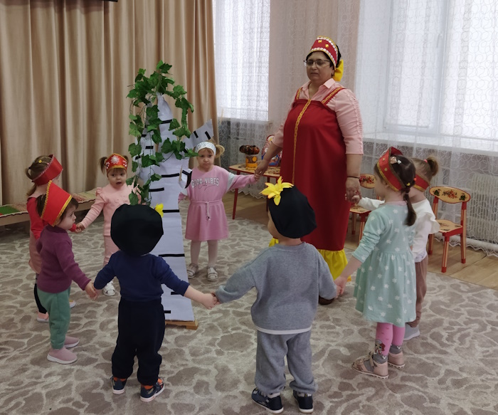 Малыши группы раннего возраста «Малыш» побывали на посиделках у хозяюшки на посиделках «Люблю березку русскую». Хозяйка (роль взяла на себя) прочитала детям о стихи березке, рассказала, что берёза является символом нашего государства-России, и все вместе завели хоровод вокруг березки с платочками.