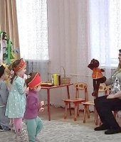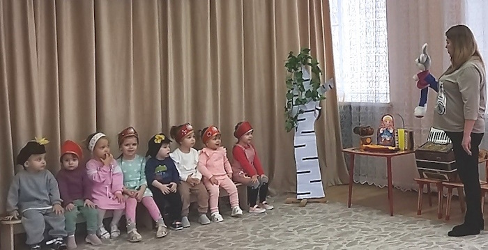В гости на посиделки заглянули заяц. С помощью куклы бибабо зайки, воспитатель Ткачева М.В. весело поиграл с ребятами в игру «Зайка серенький сидит». Убежав зайка забыл корзинку с ленточками и малыши повязали разноцветные ленточки на ветви березы. Ребята громко хлопая в ладоши и топая ножками, разбудили медведя, который заснул около березы. Вместе с Мишей ребятки исполнили веселый танец «Русская пляска». Задорно и весело подыграли русскую народную мелодию на деревянных ложках.