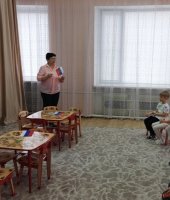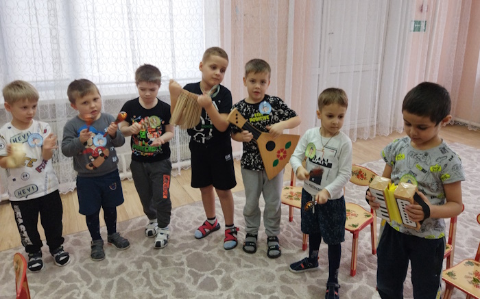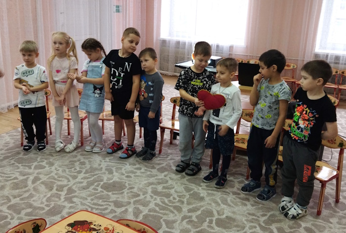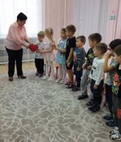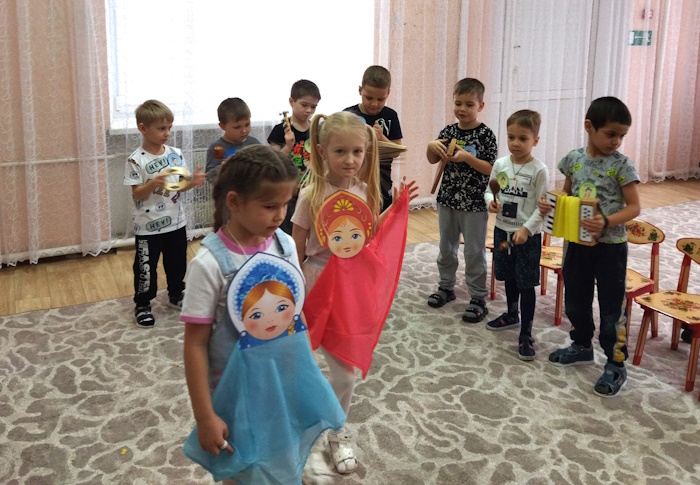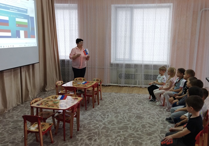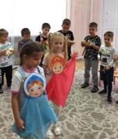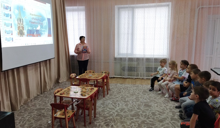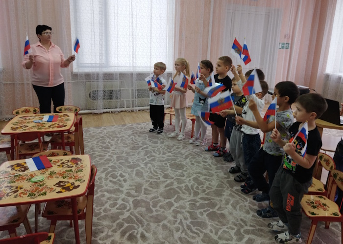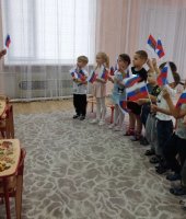 Дети посмотрели презентацию к песне «Родина моя - Россия», слушали музыку о Родине, рассмотрели иллюстрации о красоте родной природы, об исторических памятниках страны и символах государства. Вспомнили и прослушали главную песню страны – Гимн России. Через игру «Передай сердечко и скажи словечко», ребята, используя прилагательные (единственная, сильная, могучая и др.) дали определение своей Родины. В музыкальной игре «Чей кружок скорее соберется», закрепили цвета Российского флага. В ходе музыкально-ритмической деятельности воспитанники выполнили упражнения с флажками под муз. О. Газманова «Вперед Россия». Мальчики исполнили р. н. мелодию на детских музыкальных инструментах, а девочки, использовав платковый театр «Матрешки», исполнили танец.