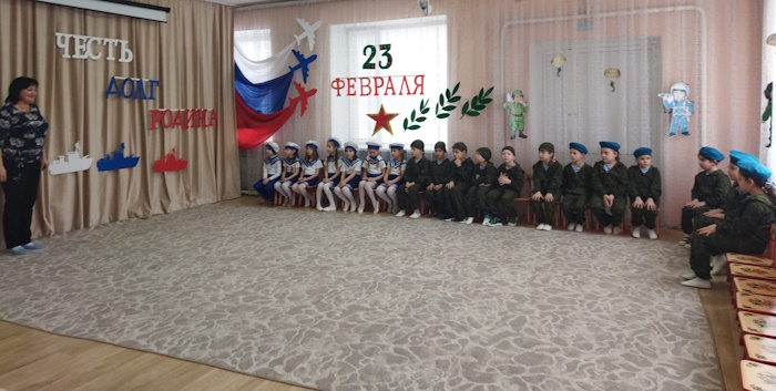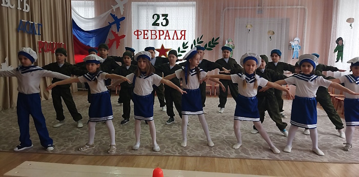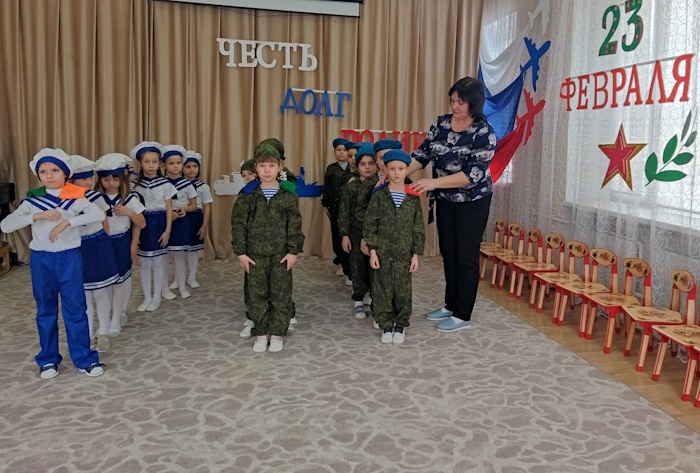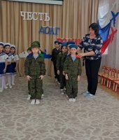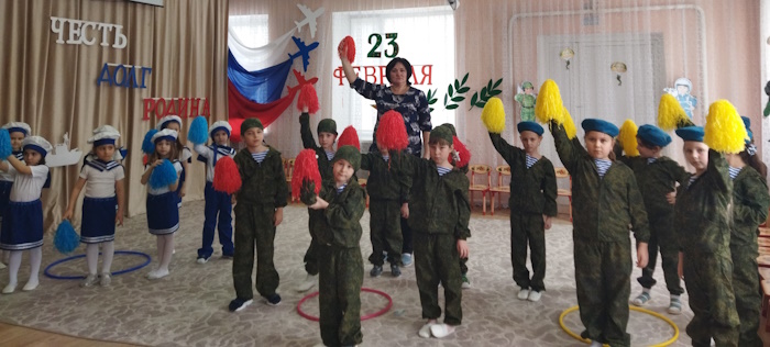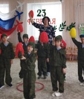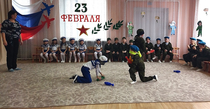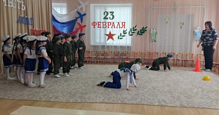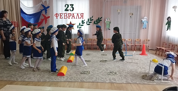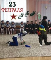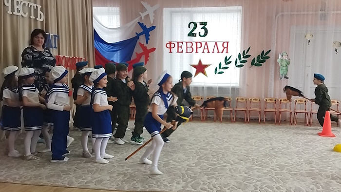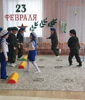 В подготовительной группе «Звёздочки» 22 февраля прошло тематическое развлечение «Военные на учениях», посвящённое «Дню защитника Отечества». Красивые и нарядные дети в костюмах моряков, десантников и разведчиков спели песню о защитниках отечества, затем разделивших на три команды: «Моряки», «Десантники», «Разведчики» окунулись в военную жизнь. Команды сделали разминку перед учениями и поучаствовали в эстафетах: «Разведчики», «Пронеси погоны», «Разминируй поле», «Пройди через болото», «Смелые наездники», в ходе которых ребята продемонстрировали ловкость, смелость, быстроту и сообразительность, показали себя как настоящие военные.