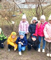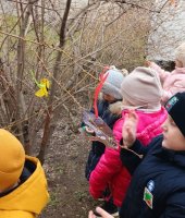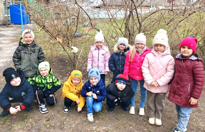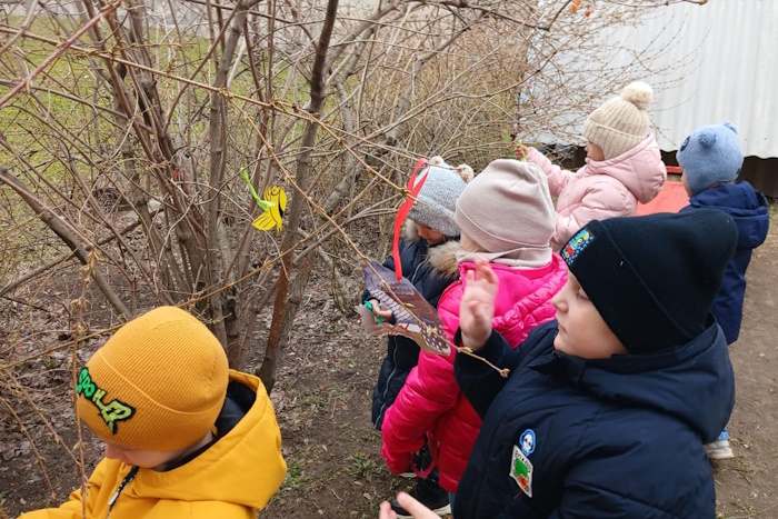 На прогулке ребята повесили заранее приготовленные птички, чтобы птицы быстрее к нам прилетели.