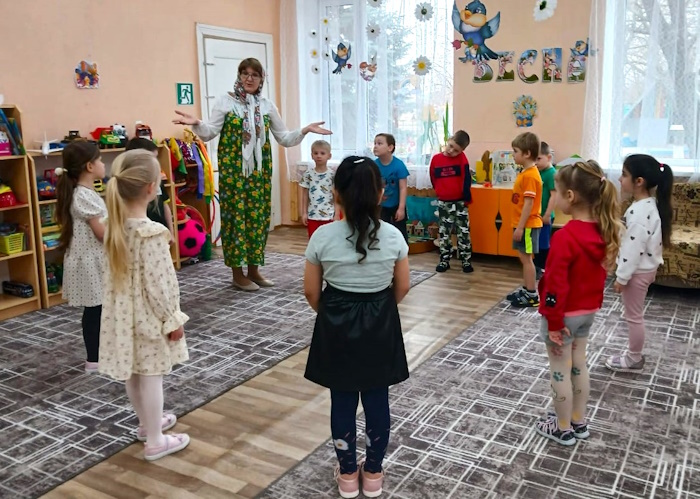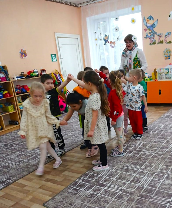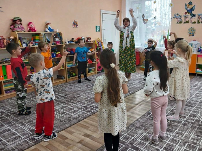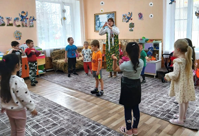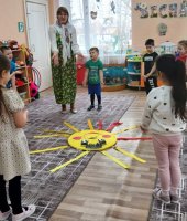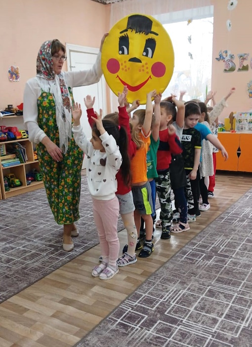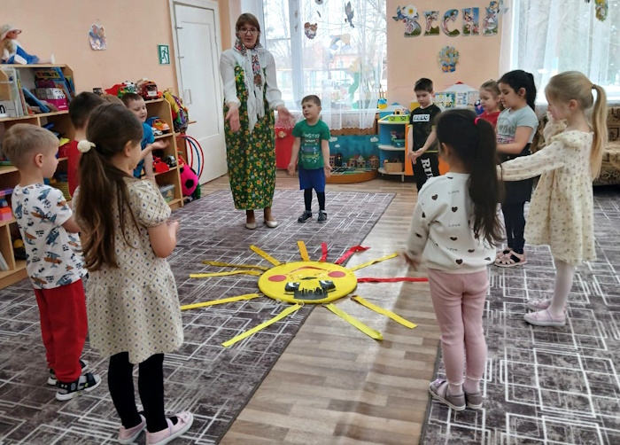 На праздник к детям пришла Сказительница Прасковья (роль взяла на себя), которая напомнила детям историю праздника. Все вместе дружно зазывали весну закличками. Весной всех людей радует солнышко, а чтобы оно ярче светило детям, поиграли в игру «Собери лучики для солнышка», «Передай солнышко другу». Затем Сказительница поиграла с ребятами в народные игры: «Ручеек», «Гори, гори, ясно».
