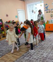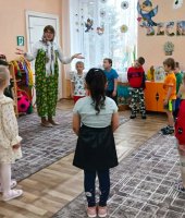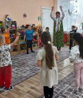 Весенний гам напоминает нам звучание колокольчика, поэтому гостья предложила поиграть в игру «Колокольчик зазвени». Дети исполнили народную песню «Во поле березка стояла» сопровождая слова жестами. Сказительница угостила ребят вкусными булочками в форме птичек Жаворонков.