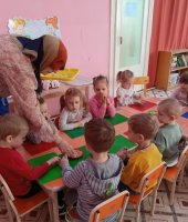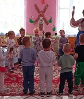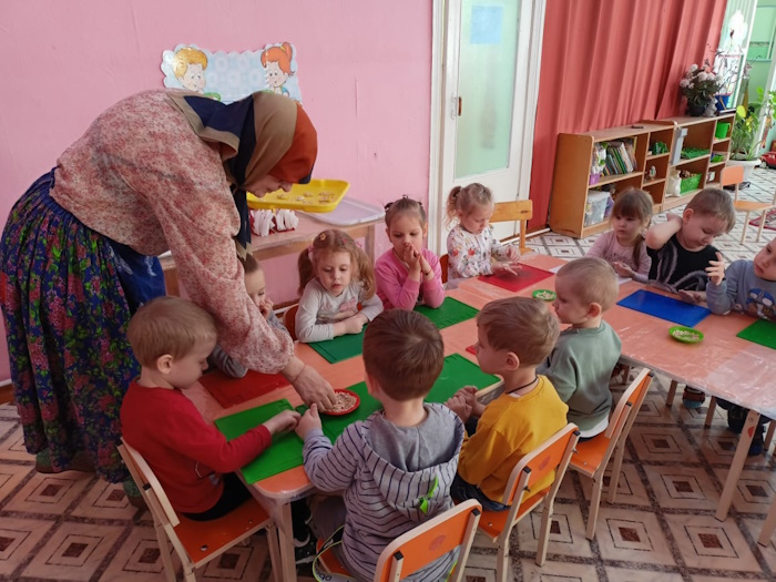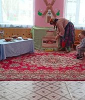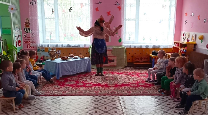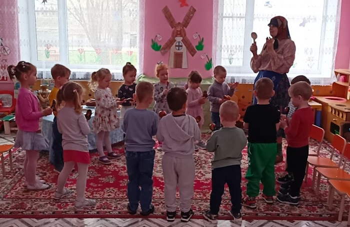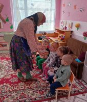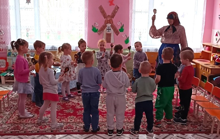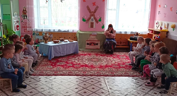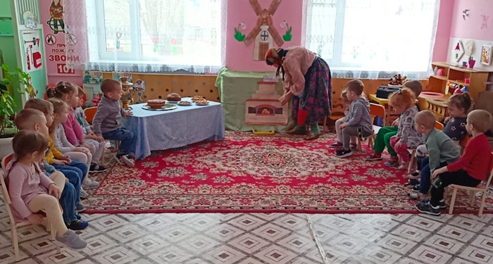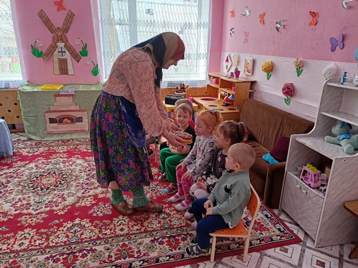 В младшей группе «Ягодки» прошла тематическая неделя «Хлеб – всему голова!». Итогом этой недели стало развлечение «В гостях у бабушки Матрены». Бабушка Матрена (роль взяла на себя) рассказала дошколятам как на Руси растят хлеб. Ребята рассмотрели мельницу, русскую печку. Матрена предложила помочь в изготовлении пряничков, где ребята проявили своё умение и творчество в украшении своих изделий. Но делу время, а потехи час и малышей Матрена пригласила на веселый перепляс «Танец с ложками». А в конце хозяйка угостила ребят ароматным пирогом.