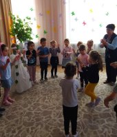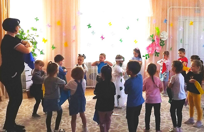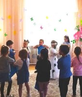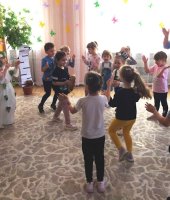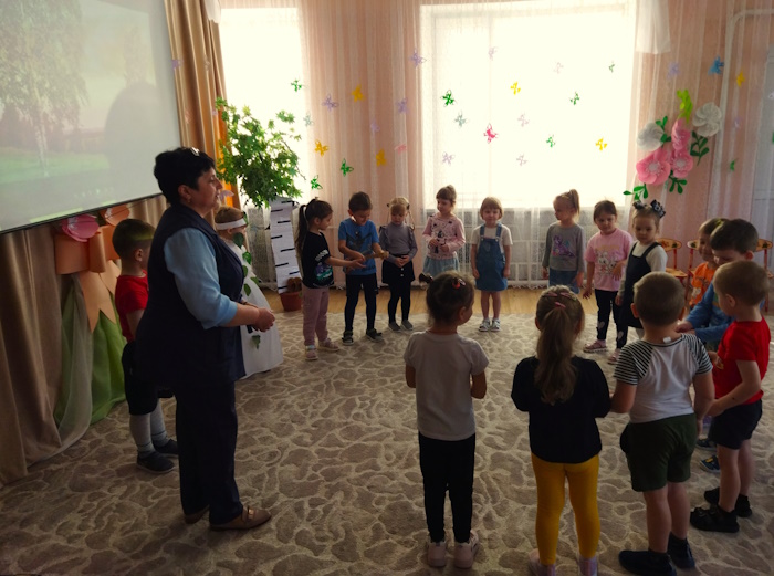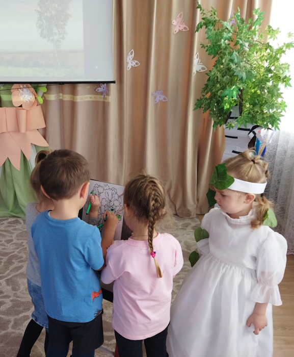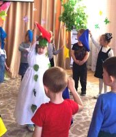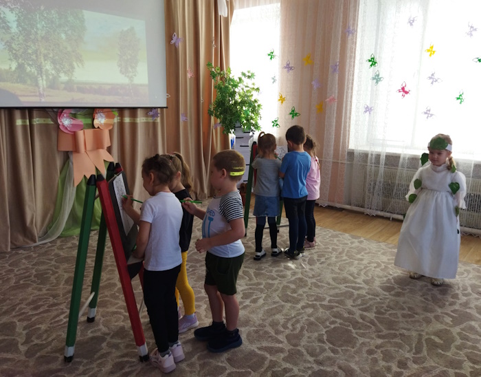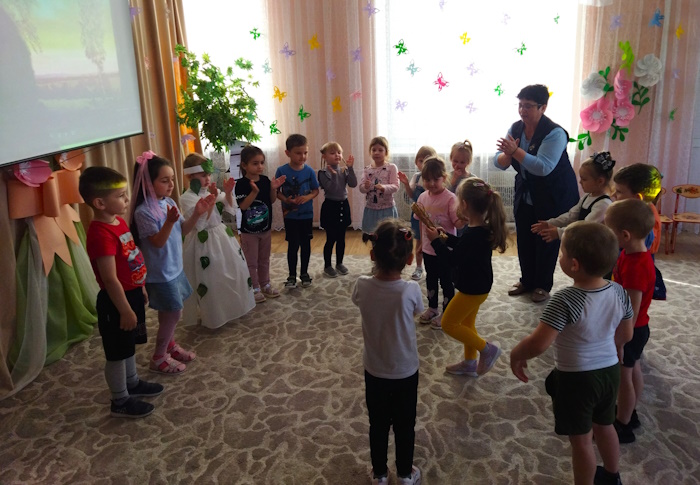 К нам в музыкальную гостиную пришла «Берёзка» (девочка Алина в костюме русской березы), и вместе с ребятами завела хоровод, «Во поле береза стояла». Все вместе весело исполнили танец с платочками, поиграли в народную игру «Передай лапти по кругу», а также помогли березке раскрасить её подружек.