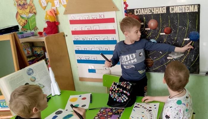 12 апреля наша страна отмечала замечательный праздник - День космонавтики. В подготовительной группе «Звёздочки» весь день был посвящен этой тематике. Для расширения кругозора воспитанники рассмотрели иллюстрации о звездном небе, созвездиях, спутниках, космодроме Байконур и фотографии космонавтов и энциклопедию «Всё о космосе». Дети послушали рассказ о космосе и космонавтах, читали стихи и загадывали загадки; увлечённо играли в дидактические игры: «Составь правильно», «Продолжи», «Назови все космическое», поучаствовали в космической викторине.