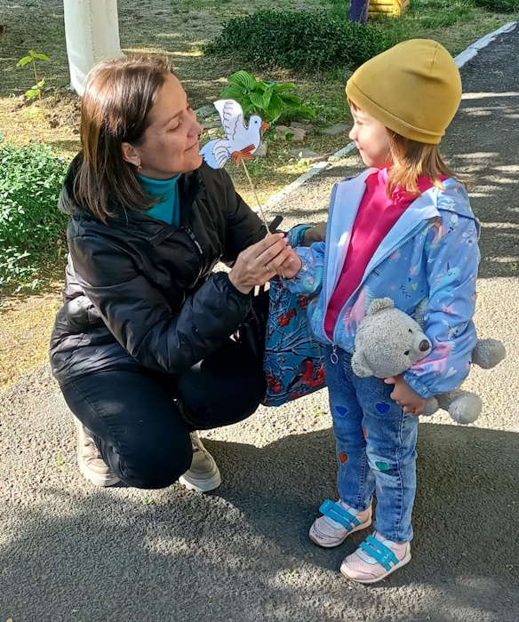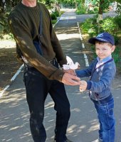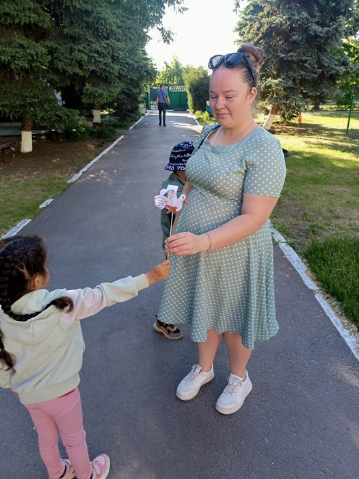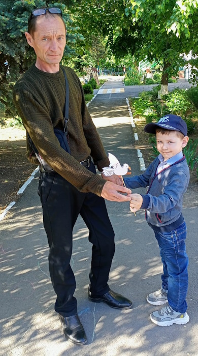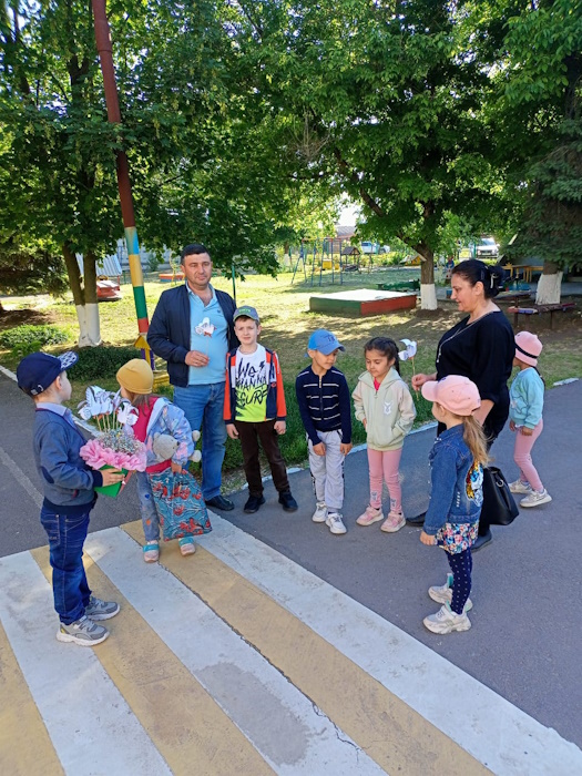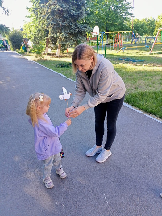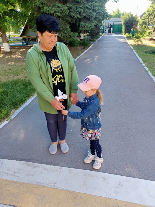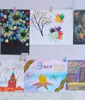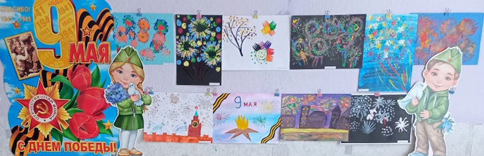 С воспитанниками средней группы «Непоседы» были проведены мероприятия посвященные празднованию Дня Победы - беседы: «Праздник со слезами на глазах!», «День Победы»; рассматривание репродукций и фотографий из серии «9 мая - День Победы»; оформлена выставка рисунков «Салют Победы», выполненных в нетрадиционной технике рисования детьми совместно с родителями. Детишки прослушали песню «Священная война», гимн Победы, а также посмотрели презентацию «День Победы». Активное участие ребята приняли в акции «Голубь мира - голубь Победы!». На участке нашего детского сада под аудиозапись песни И.О. Дунаевского «Летите, голуби, летите!» дети раздавали родителям белых бумажных голубей с Георгиевской ленточкой. Участием в этой акции, каждый из нас выразил свою благодарность ветеранам ВОВ, отстоявшим нашу Родину в трудные годы войны.
