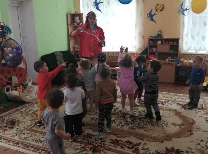 Детство… Как много смысла в этом слове! Как много прекрасного, чистого, светлого вызывает в каждом из нас это слово! Детство — это счастье, радость, смех, мечты, дружба! В группе раннего возраста «Малыш» в рамках тематической недели «Счастливое детство» мы с детками вместе играли в различные дидактические, строительные, сюжетно – ролевые игры. Итогом недели был «Праздник воздушных шаров». В гости к малышам пришел Петрушка (роль взяла на себя) с воздушными шарами и мыльными пузырями. Петрушка поиграл с ребятами в веселые игры, а также подарил воздушные шарики с которыми также все поиграли. Малыши весело и задорно провели время с Петрушкой.