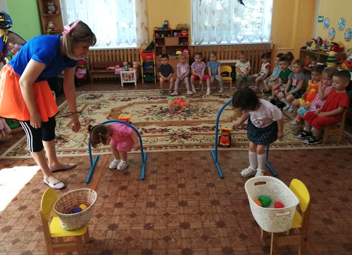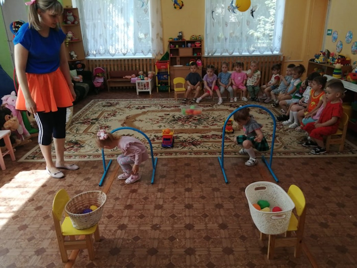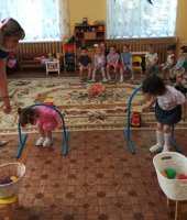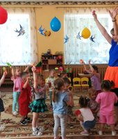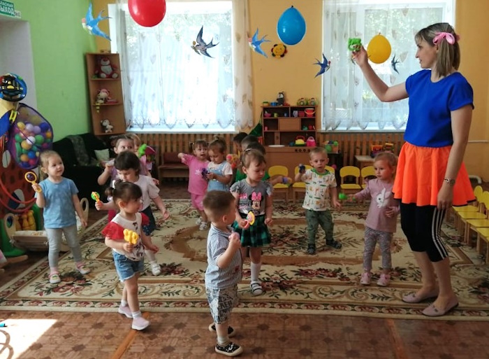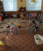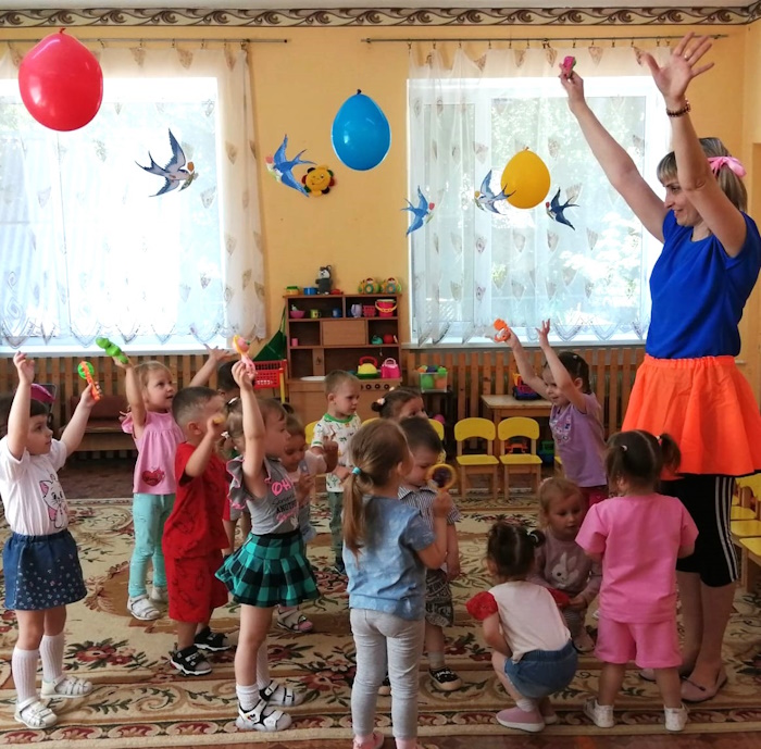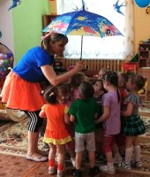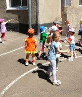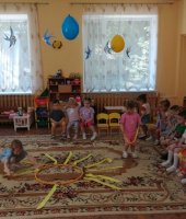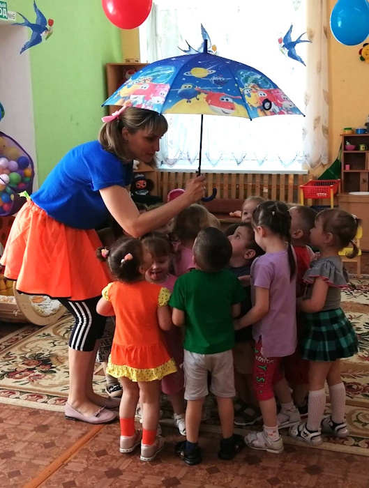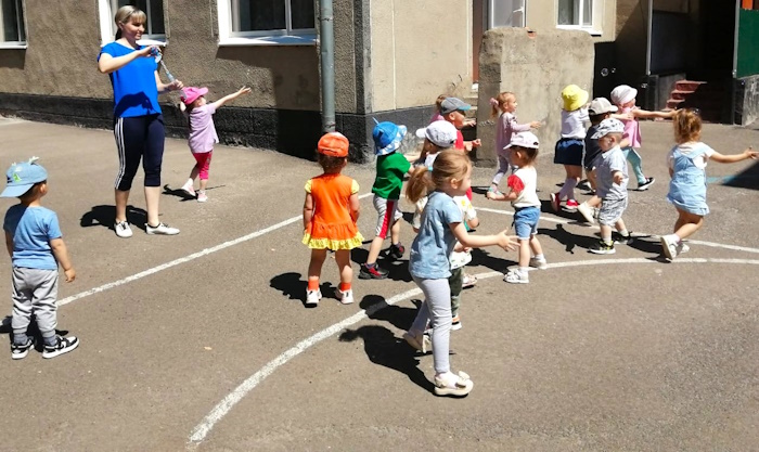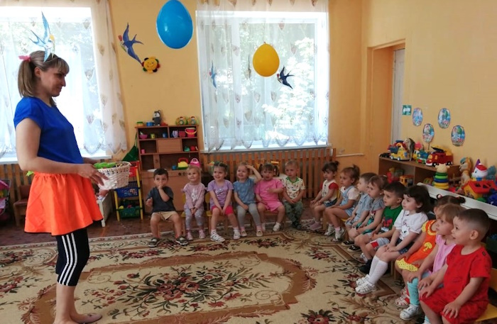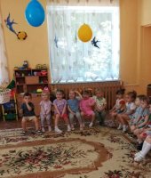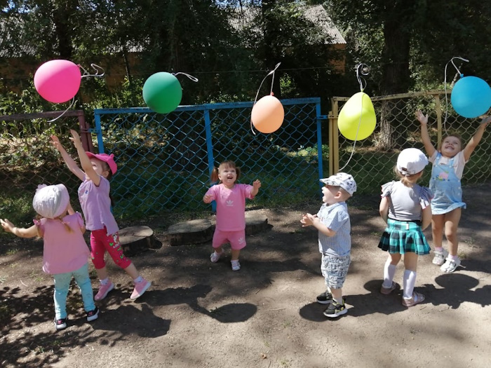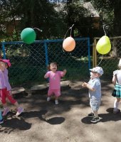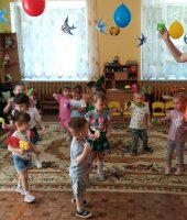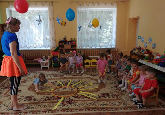 Мы с детьми группы раннего возраста «Малыш» 3 июня праздновали день защиты детей весело и задорно. Поздравить малышей с праздником пришла «Ириска» (роль взяла на себя). Ириска поиграла с ребятами в игру «Солнышко и дождик», провела небольшие спортивные соревнования, с удовольствием детки танцевали. А еще ребята сложили из обруча и ленточек символ лета – Солнышко. на прогулке На прогулке продолжили праздновать: играли с мыльными и воздушными шарами, рисовали на дорожках различные фигурки.