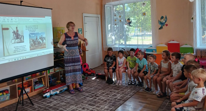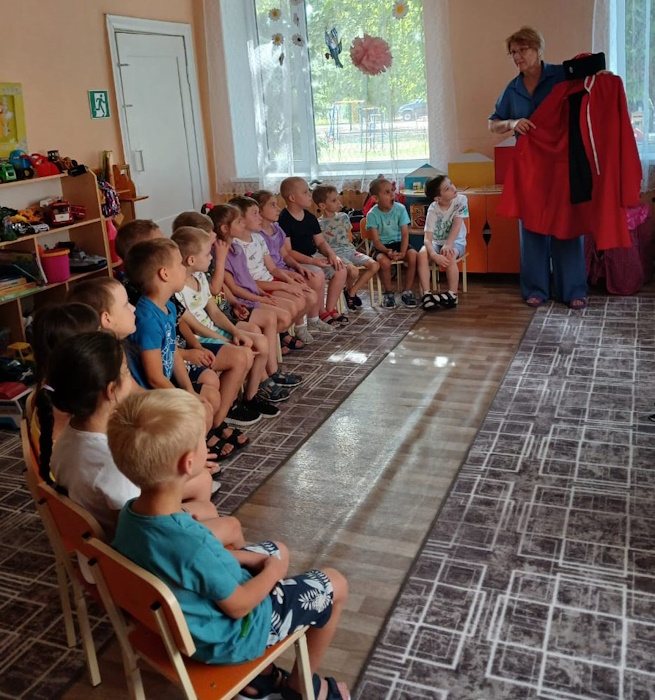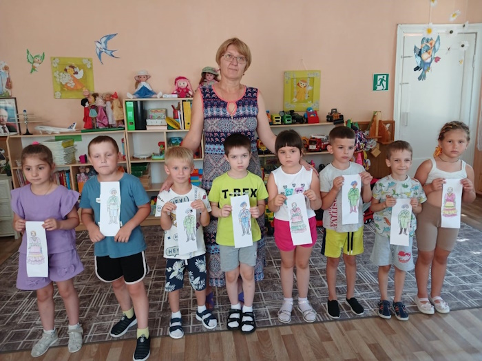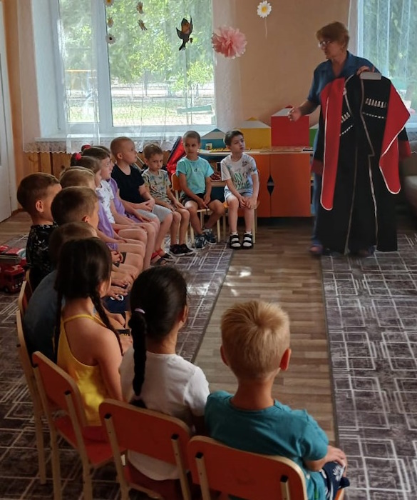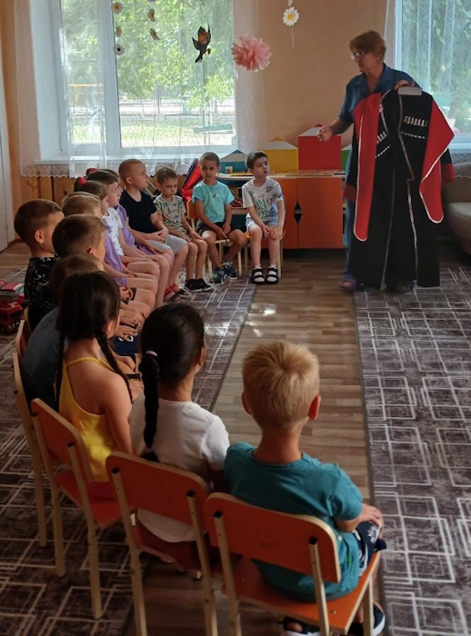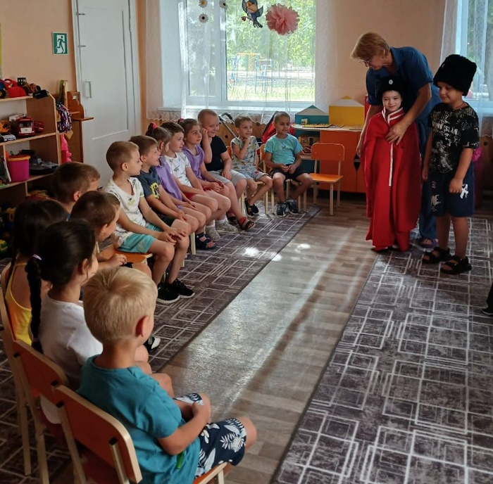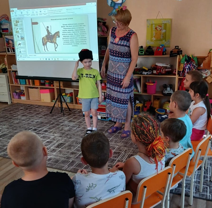 В рамках тематической недели «Мой край Донской» мы с ребятами группы «Капельки» разговаривали о жизни и быте казаков, дружно вспомнили казацкие пословицы, рассматривали и примеряли костюм казака. Дети слушали и пели казачьи песни, вспоминали знакомые слова из казачьей лексики (батя, папаха, глечик, крынка, курень, лапти и др.), раскрасили костюмы казака и казачки.