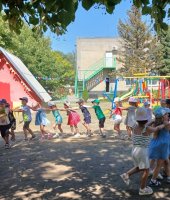 К ребятам пришёл в гости Антошка (роль взяла на себя). Дети прокатили гостя на музыкальном проезде «Антошка». Затем ребята с удовольствием принимали участие в эстафетах: «Передай мяч», «Попади в ворота», «Пробеги не упади», «Попади в обруч», «Змейка». Очень весело и дружно команды перетягивали канат. Победила - конечно же дружба!