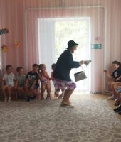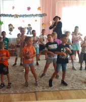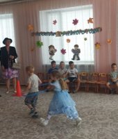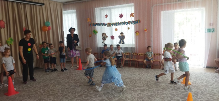 А в музыкальном зале ребят встретила муз. руководитель Ермак Л.В. ребята пели и танцевали, но появилась Шапокляк (в роли Локоть Н.Л.), которая забыла про праздник. Все вместе закрепили знания о безопасном поведении, о правилах дорожного движения, помогли Светофору (в роли Улевская Н.Г.), участвовали в конкурсах, играх-соревнованиях, разгадывали загадки, много шутили и смеялись. Закончился праздник танцевальным флешмобом.