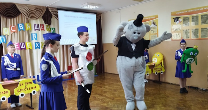 Команды ЮПИД «Светлячки» и «Перспективные ребята» на празднике «Посвящение первоклашек в пешеходы»