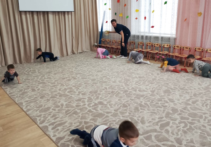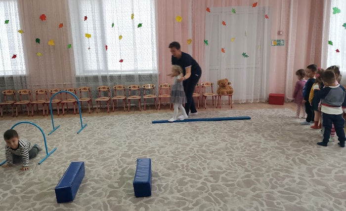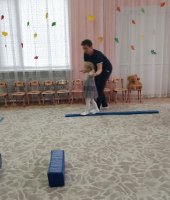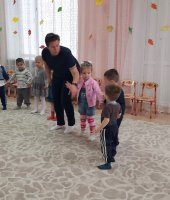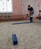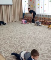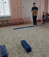 Малыши выполнили общеразвивающие упражнения с платочками и показали Мишке, что умеют ходить по мостику, пролезать под дугами, перепрыгивать через бревна. Затем Мишка поиграл с ребятами в подвижную игру «Разбуди Мишку». Дети играли весело и задорно.