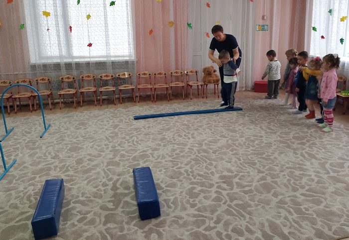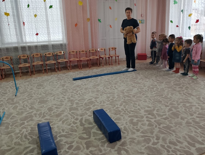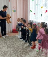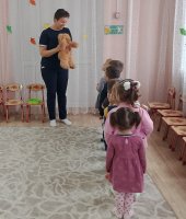 В младшей группе «Звездочки» прошло физкультурное занятие «Мишка в гостях у ребят». Занятие началось со строевых упражнений. После появился Мишка, ему очень захотелось посмотреть как малыши занимаются физкультурой.